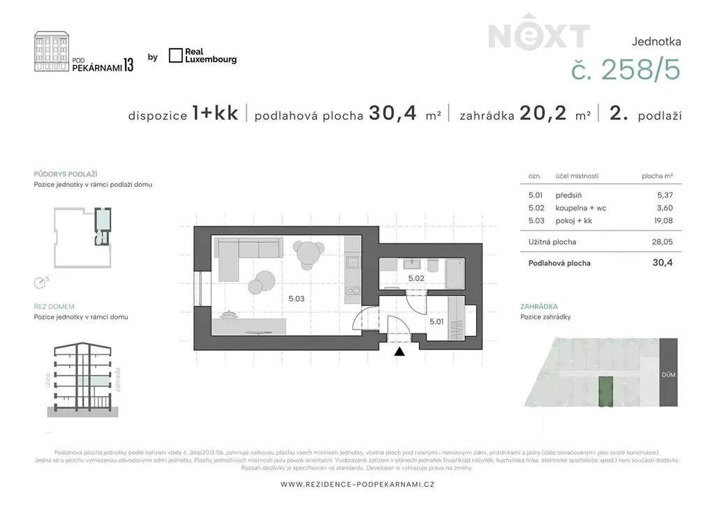 Rád bych Vám v rámci výhradního zastoupení developera představil byt 1+kk o podlahové ploše 30,4 m² v citlivě rekonstruovaném projektu Rezidence Pod Pekárnami 13, situovaném v klidné části Prahy 9. Byt se nachází ve 2. nadzemním podlaží, je orientovaný na severozápad, směrem do dvora a jeho benefitem je soukromá zahrádka o výměře 20,2 m².
