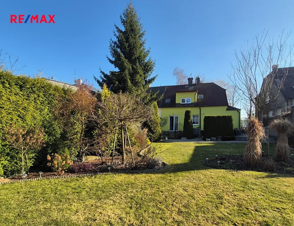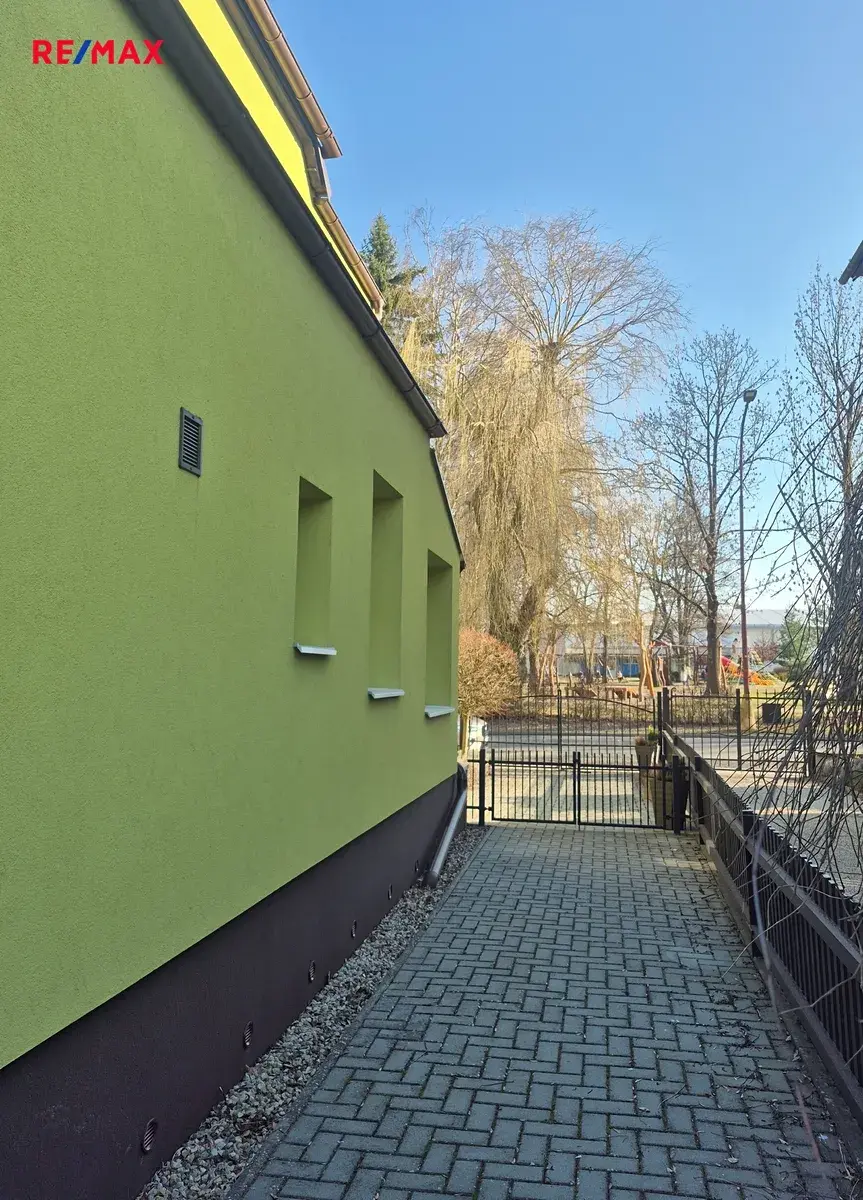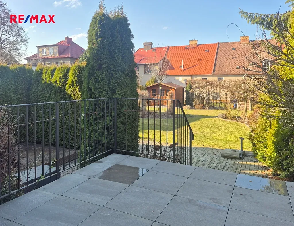 Terasa a část kolem domu je vydlážděná. Před domem je malá okrasná předzahrádka, vzadu za domem zahrada o výměře 284 m2 s dřevěným zahradním domkem, vydlážděná část má výměru 27 m2.