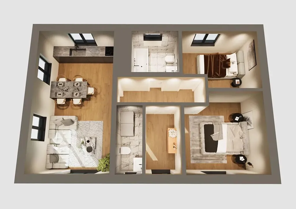 Tento dům nabízí plnohodnotné bydlení až pro 3-4 osoby. Takové bydlení vám nabídne obývací pokoj s prakticky odděleným kuchyňským koutem, ložnici a dětský pokoj či pracovnu. Součástí rodinného domu je zádveří se šatnou, technická místnost a koupelna s WC.