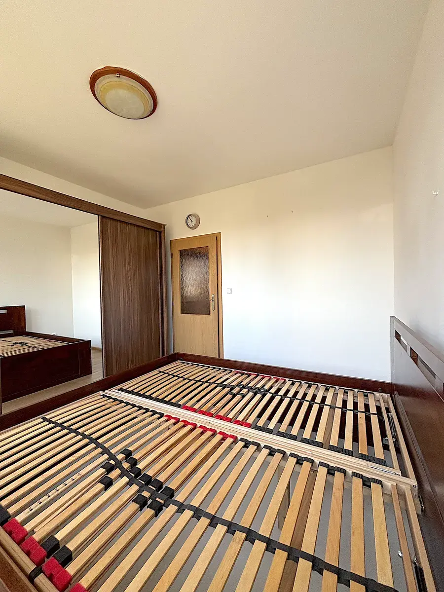 Dalším pokojem je ložnice. Zde je již připravena manželská postel s úložným prostorem a velká šatní skříň. Z ložnice je taktéž možné vejít na balkón.