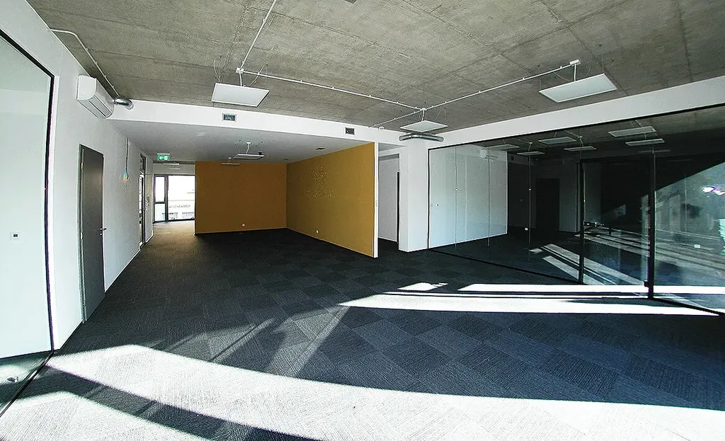 K pronájmu je aktuálně k dispozici celé kancelářské patro ve 2. nadzemním podlaží o celkové ploše 221 m², doplněné o venkovní odpočinkovou terasu o velikosti 92 m². Prostor nabízí atraktivní a vzdušné řešení interiéru – přibližně polovina plochy je řešena jako open space, což umožňuje flexibilní využití dle potřeb nájemce. Světlá výška místností dosahuje velkorysých 3,1 m. Pohledový beton v kombinaci s velkoformátovými prosklenými plochami dodává interiéru moderní, lehce industriální charakter. Samozřejmostí je kuchyně a sprchový kout. K dispozici je dámské i pánské WC a také technická komora.