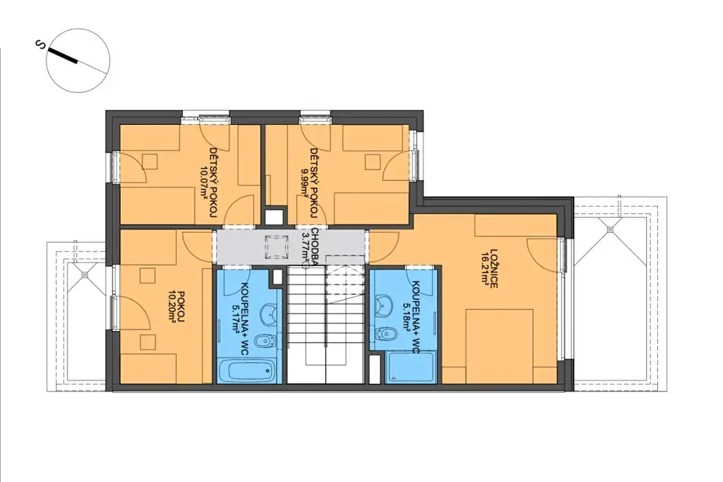 V přízemí se nachází hlavní obytný prostor s obývacím pokojem, kuchyní a jídelnou, ze kterého se velkými francouzskými okny vstupuje přímo na terasu a zahradu. Součástí podlaží je také samostatná toaleta, technická místnost a přímý vstup do garáže. V patře je klidová část domu se čtyřmi samostatnými pokoji a koupelnou, což dává dostatek prostoru pro ložnici, dětské pokoje i pracovnu.