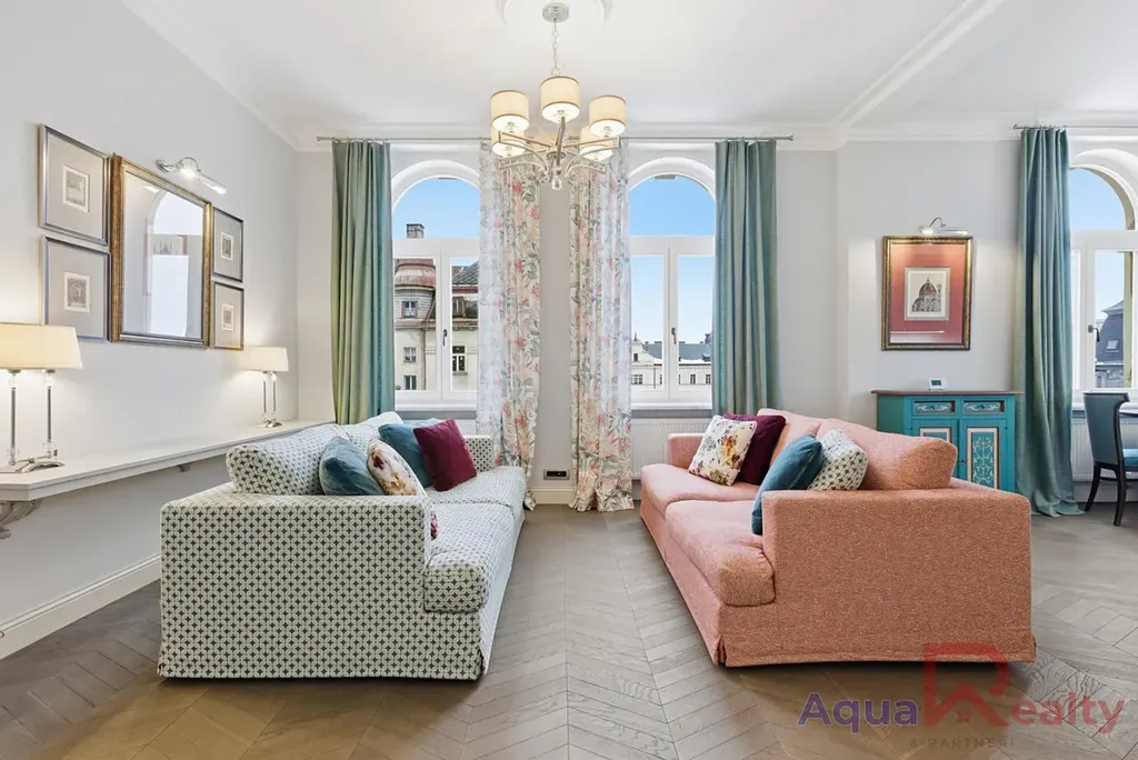 Na návrhu interiéru se podílel architekt a interiérový designér, kteří vytvořili prostor v duchu klasické estetiky s moderním přesahem. Najdete zde vysoké stropy a oblouková okna, která dodávají bytu vzdušnost, sofistikované barevné ladění, které působí harmonicky a útulně, kvalitní nábytek a pečlivě vybrané doplňky, které podtrhují charakter celého prostoru.