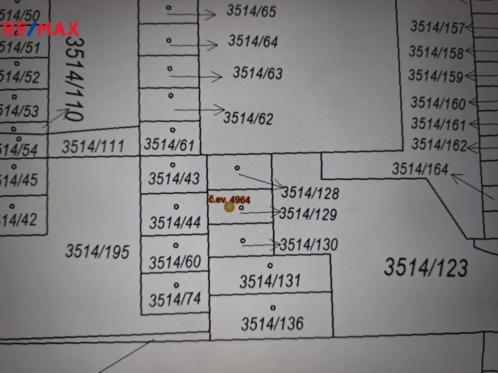 Garáž je situována na pozemku parc. č. 3514/129, evidenční číslo stavby 4964, se zastavěnou plochou 18 m².