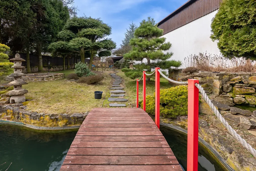 Zahrada v pojetí feng-shui nabízí prostor pro relaxaci a odpočinek. Nalezneme zde zastřešené sezení, ohniště, dřevník a studnu. Dominantu zahrady tvoří jezírko s celoroční filtrací pro okrasné japonské ryby kapr koi.