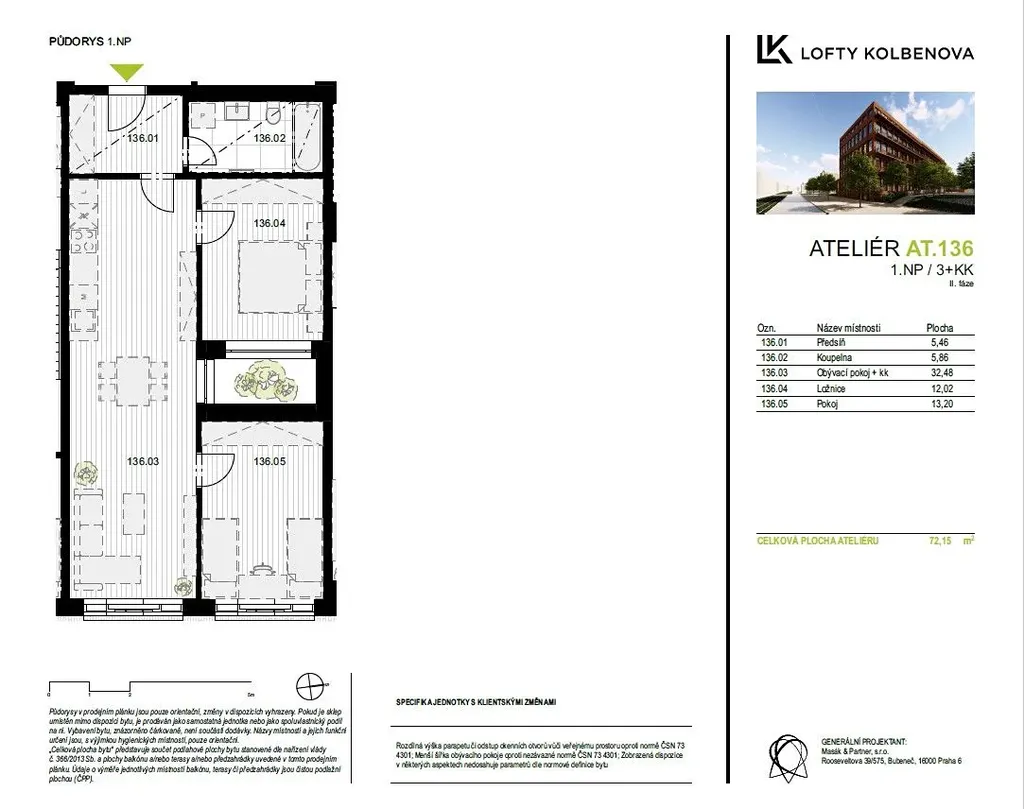 V zastoupení developera nabízíme k prodeji ateliér o dispozici 3+kk s celkovou výměrou 72 m2. Ateliér se nachází v přízemí objektu, téměř u hlavního vchodu. Je nadstandardně vybaven rekuperací, klimatizací, podlahovým topením a předokenními elektrožaluziemi.