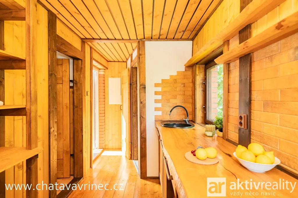 Přízemí (24 m2): plně vybavená kuchyně s masivní jasanovou deskou, obývací pokoj s krbovými kamny, samostatné WC.