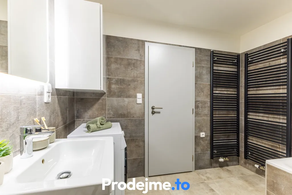 Koupelna je vybavena vanou, toaletou, umyvadlem, pračkou a dvěma otopnými žebříky. O úložné prostory je postaráno díky vestavné skříni na míru v chodbě a vlastnímu sklepu o velikosti 2,5 m2 v suterénu domu.