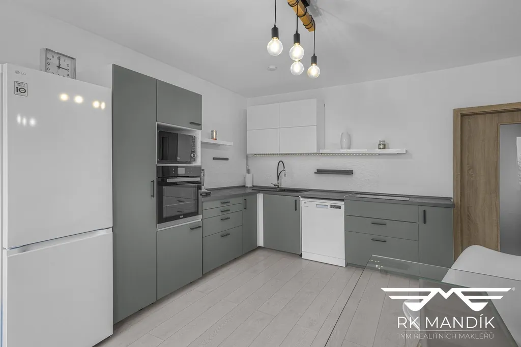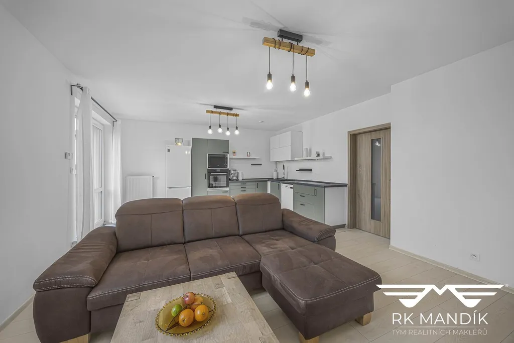 Dispozici bytu tvoří prostorná vstupní chodba s úložným prostorem a místem pro vestavnou skříň, obývací pokoj s integrovaným kuchyňským koutem a přímým vstupem na terasu a zahradu, a dále dva samostatné pokoje. Kuchyňský kout je vybaven linkou s vestavnými spotřebiči: indukční varnou deskou, elektrickou troubou a myčkou nádobí.