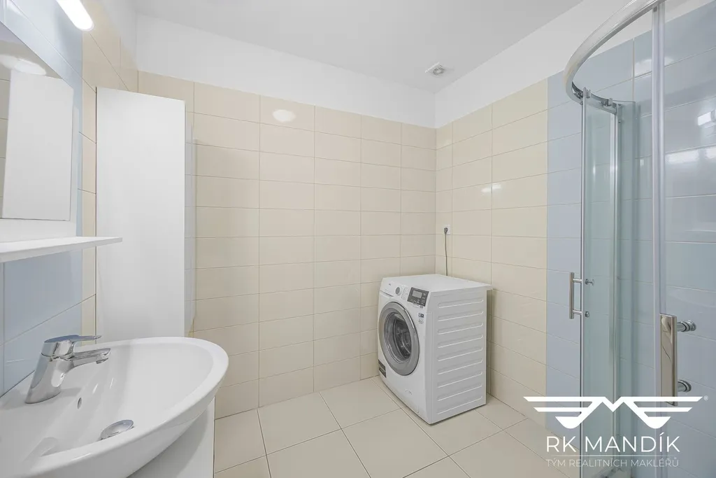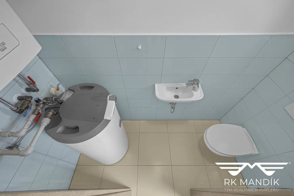 Koupelna disponuje sprchovým koutem, umyvadlem a prostorem pro pračku. Toaleta je oddělená a její součástí je i technické zázemí s elektrickým kotlem pro vytápění domu a elektrickým bojlerem o objemu 120 l pro ohřev teplé vody.