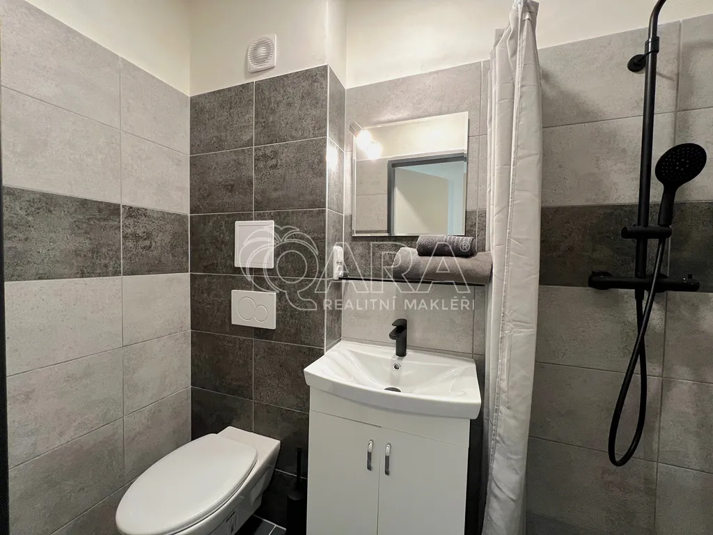Koupelna nabízí moderní sprchový kout, závěsné WC Geberit a umyvadlo se skříňkou. Design je laděn do současných trendů – antracitové obklady a dlažba v kombinaci se šedou laminátovou podlahou v obytné části.