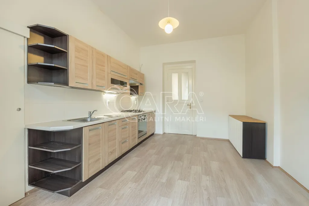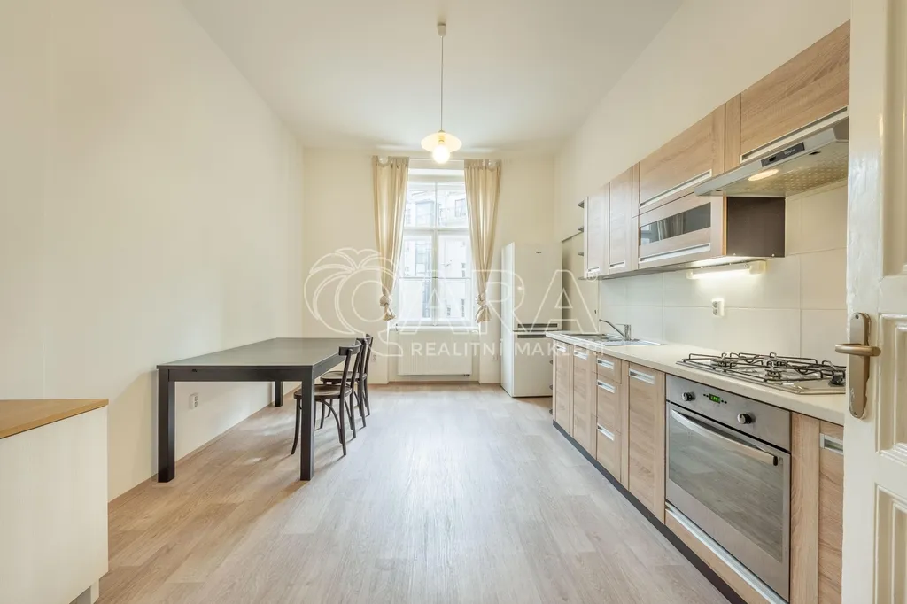 Dispozici tvoří obývací pokoj o velikosti 22,8 m² a sousedící pokoj o velikosti 18 m², oba orientované na sever do ulice Lužická. Do klidného vnitrobloku na jih směřuje ložnice o velikosti 16,3 m² a také samostatná kuchyně o stejné velikosti, která je vybavena kuchyňskou linkou, plynovou varnou deskou, elektrickou troubou, velkou lednicí a jídelním stolem se židlemi.