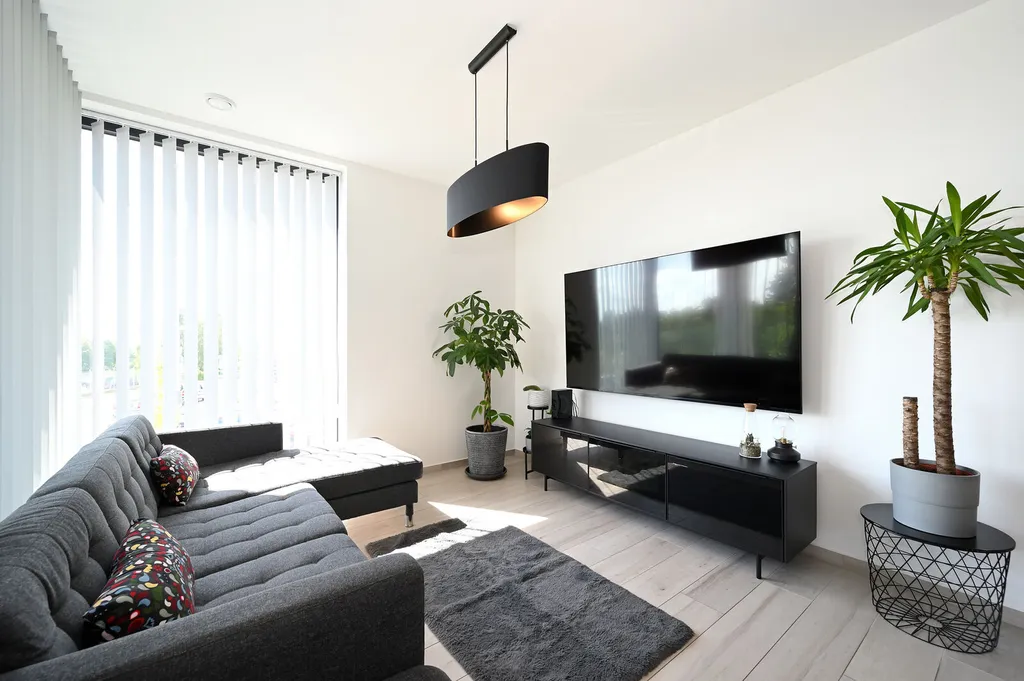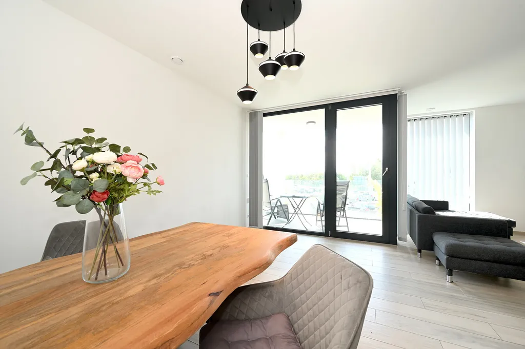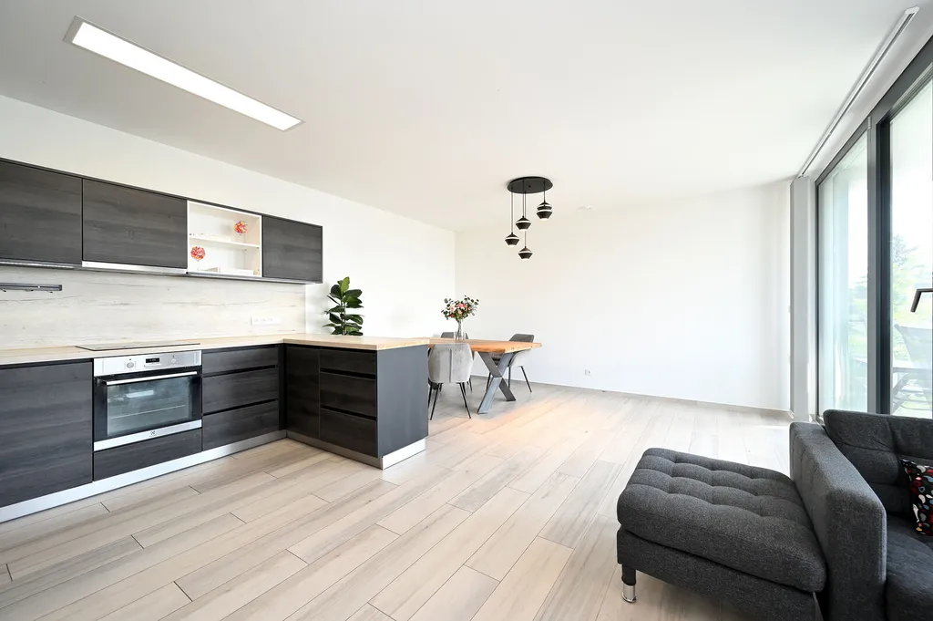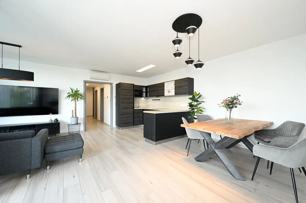 Světlý obývací pokoj je propojen s kuchyňským koutem, který je plně vybaven moderními spotřebiči, jako jsou vestavěná lednice s mrazákem, el. trouba, digestoř, myčka a mikrovlnná trouba. Z obývacího pokoje je přímý přístup na lodžii, která je ideálním místem pro relaxaci.