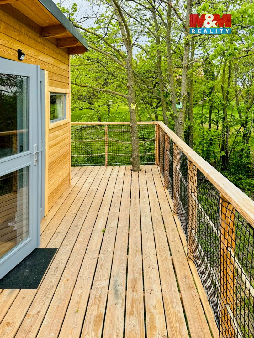 Stavba o ploše 30 m² je navržena pro pohodlný pobyt i celoroční využití. Uvnitř najdete útulný obytný prostor s dvoulůžkem, praktický kuchyňský kout, samostatnou ekologickou toaletu. Na střeše je fotovoltaický panel pro napájení LED osvětlení, varné konvice a sprchy. V chladnějších dnech oceníte samostatné bezpečné vytápění, které zajišťuje příjemné teplo.