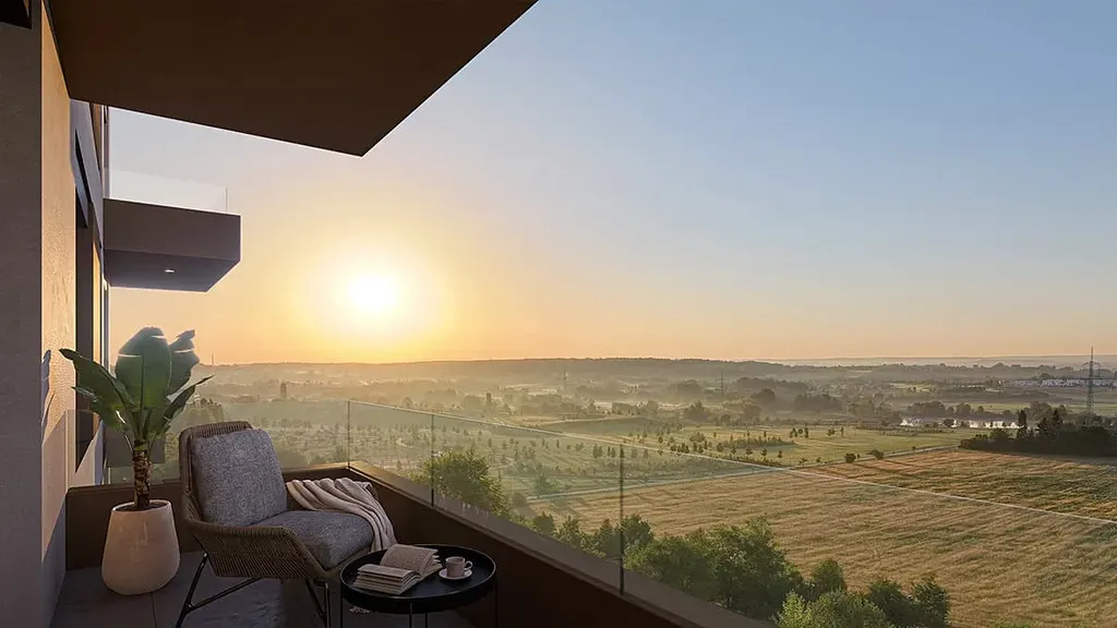 Samotný byt nabízí promyšlené dispoziční řešení, dostatek přirozeného světla a balkon s příjemným výhledem. Interiér je dokončen ve vysokém standardu – kvalitní plovoucí podlahy a velkoformátová dlažba podtrhují moderní charakter bytu. Byt je připraven na instalaci kuchyňské linky dle vlastních představ nového majitele.