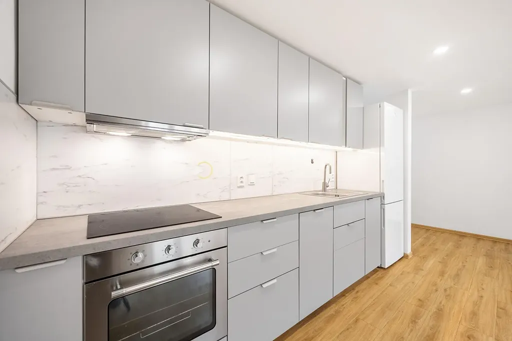 Byt nabízí plně vybavenou kuchyňskou linku, dřevěnou plovoucí podlahu, dřevěná okna se žaluziemi.
