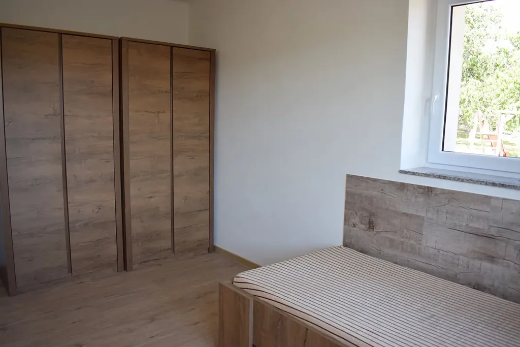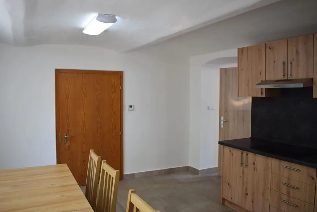 V Těšovicích u Prachatic, pronájem kompletně zrekonstruovaného domu o velikosti 4+ 1. Sestává se: v přízemí chodba, šatna, technická místnost, WC, prostorná kuchyně vybavená kuchyňskou linkou (mikrovlnná trouba, elektrický sporák se sklokeramickou deskou, digestoř, lednice), velký stůl se židlemi, pokoj se skříní a postelí. V patře 3 pokoje, dvě samostatné WC mísy, dvě sprchy a umyvadla, úložný prostor. Dům je vybaven částečně i novým nábytkem: 8 postelí s nočními stolky a osm šatních skříní. Před domem možnost venkovního posezení. Majitel rekonstruoval nabízenou nemovitost za účelem pronájmu firmám pro ubytování řemeslníků. Lze však i užívat rodinou s dětmi a přizpůsobit si vybavení místností dle svých představ. Před vchodem do rodinného domu je dvorek, který lze využívat k posezení. Klidná a příjemná část obce. Do Prachatic 5 km, na přechod Strážný 35 km. PENB nebyl dodán, proto uvádíme třídu G. Majitel požaduje kauci ve výši jednoho nájemného + provize RK jeden nájem.