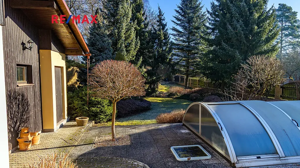 Velkým benefitem této nemovitosti je také zastřešený venkovní bazén s technologií slané vody, který umožňuje koupání po většinu sezóny. Okolní zahrada nabízí dostatek prostoru pro relaxaci, posezení s rodinou nebo přáteli a zároveň je velmi dobře udržovaná a prakticky řešená.