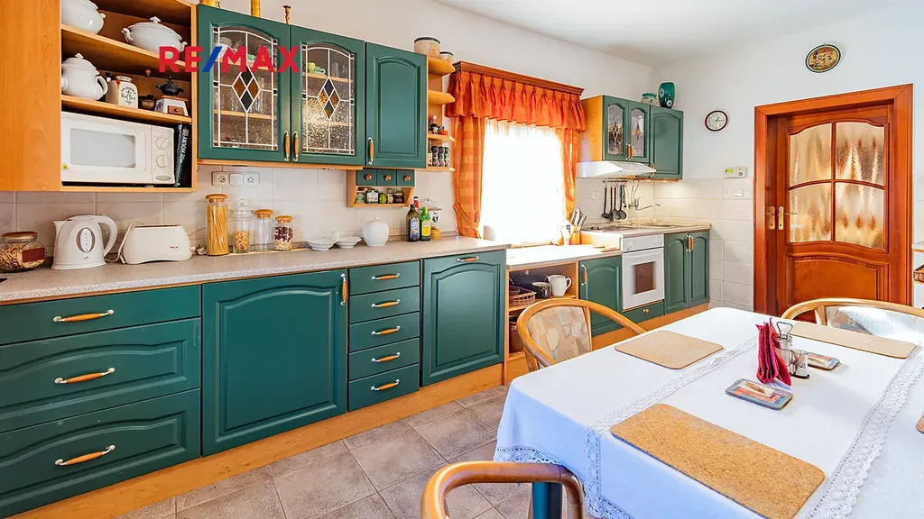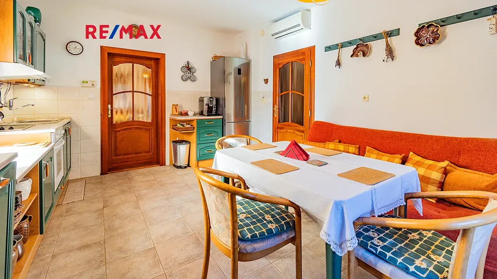 Součástí domu je rovněž plně vybavená kuchyně s jídelní částí, která nabízí dostatek prostoru pro každodenní rodinný život.