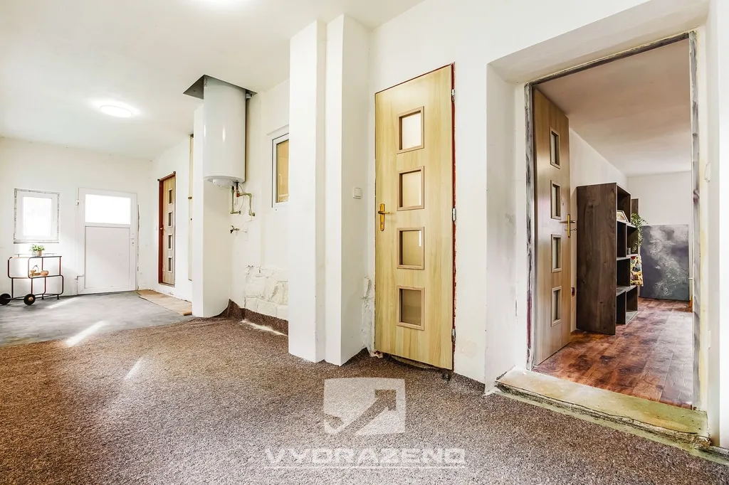 V přízemí je obývací pokoj s kuchyňským koutem, tři pokoje, chodba, koupelna s vanou a WC. Podkrovní prostor s možností rozšíření. Kolna a velká stodola.