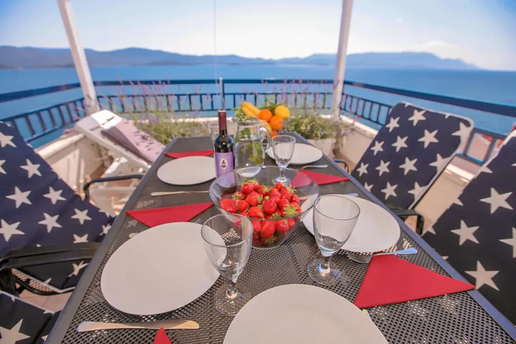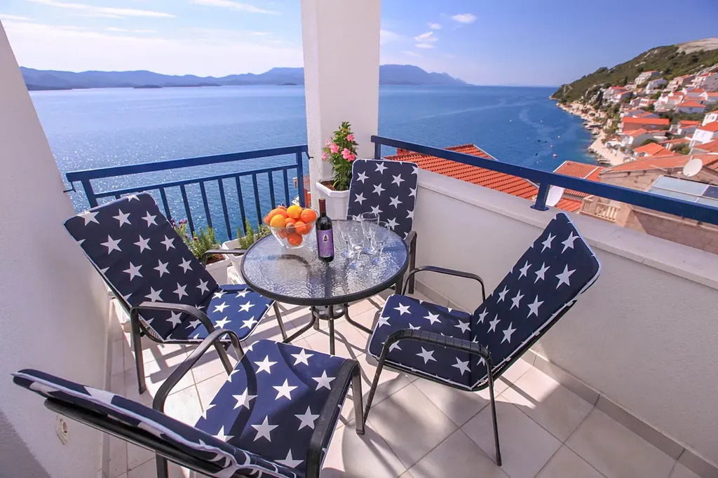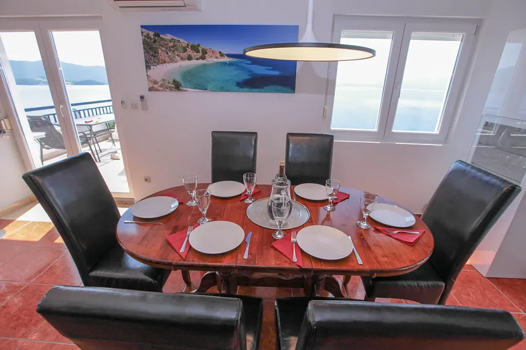 Apartmán o celkové ploše 111 m2 (85,6 m2 interiér + jedna terasa a dvě lodžie o celkové ploše 25,5 m2), se nachází v nejvyšším, 3. patře, což zaručuje absolutní klid a soukromí. Interiér je promyšlen do posledního detailu. Srdce apartmánu (34 m²) je obrovský, vzdušný obývací pokoj propojený s kuchyní a jídelnou. Místnosti dominují designová světla a stylový dřevěný bar. Celý prostor je díky oknům a proskleným vstupům na terasy nádherně prosvětlený a během pobytu Vám neustále nabízí výhledy na moře a ostrovy. Penthouse disponuje úctyhodným venkovním prostorem. Z hlavní terasy s elektrickým grilem se nabízí dechberoucí výhledy na moře a nezapomenutelné západy slunce nad ostrovem Hvar. Další dvě boční lodžie patří k ložnicím. Klidová část nabízí tři samostatné neprůchozí pokoje vybavené kvalitními lůžky se zdravotními matracemi. Prostorná koupelna s vanou, pračkou a WC je doplněna o velmi praktické samostatné WC pro hosty.