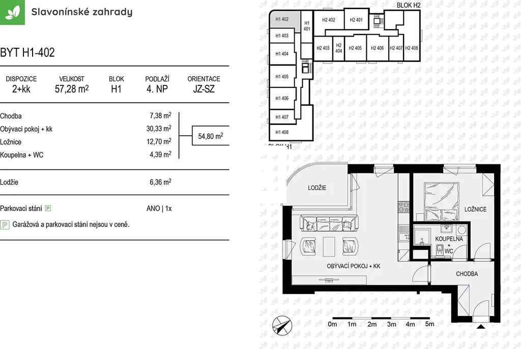 Byt s podlahovou plochou 57,28 m2 + balkon 6,36 m2 nabízí naprostý klid,