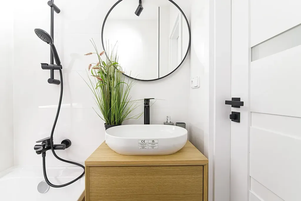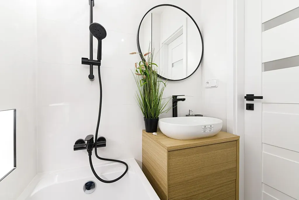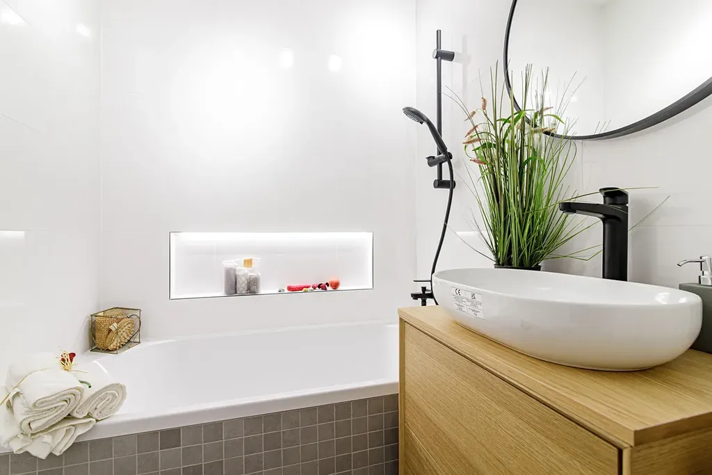 Zděná koupelna s obklady a dlažbou, které k sobě ladí, nová sanita.