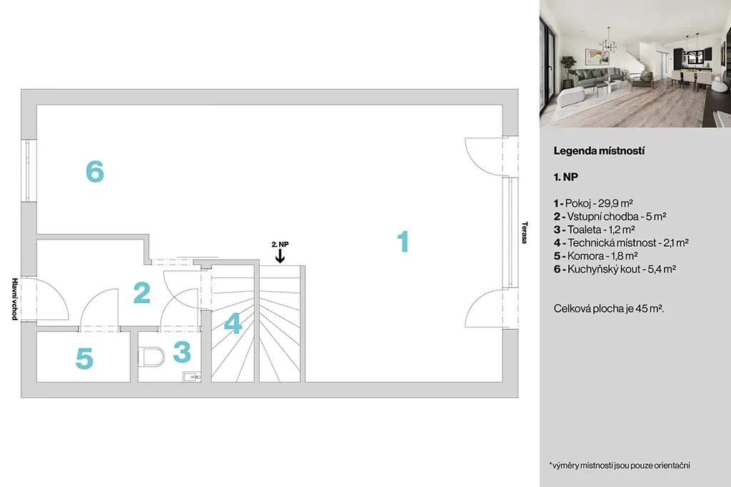 2x samostatné WC, 2x technická místnost, předzahrádka přístupná s terasy z obývacího pokoje, 2x parkovací stání před domem.