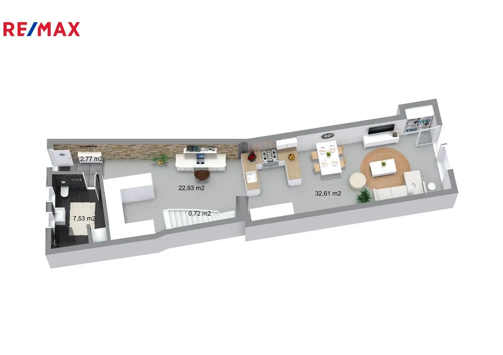 Řadový, patrový rodinný dům 2+kk s otevřenou dispozicí - loft, Blučina, ul. Komenského. Celková plocha pozemku 181 m2, užitná plocha domu cca 95 m2.