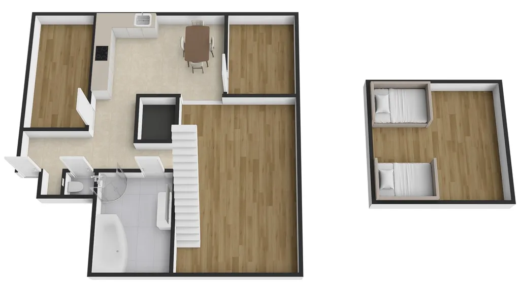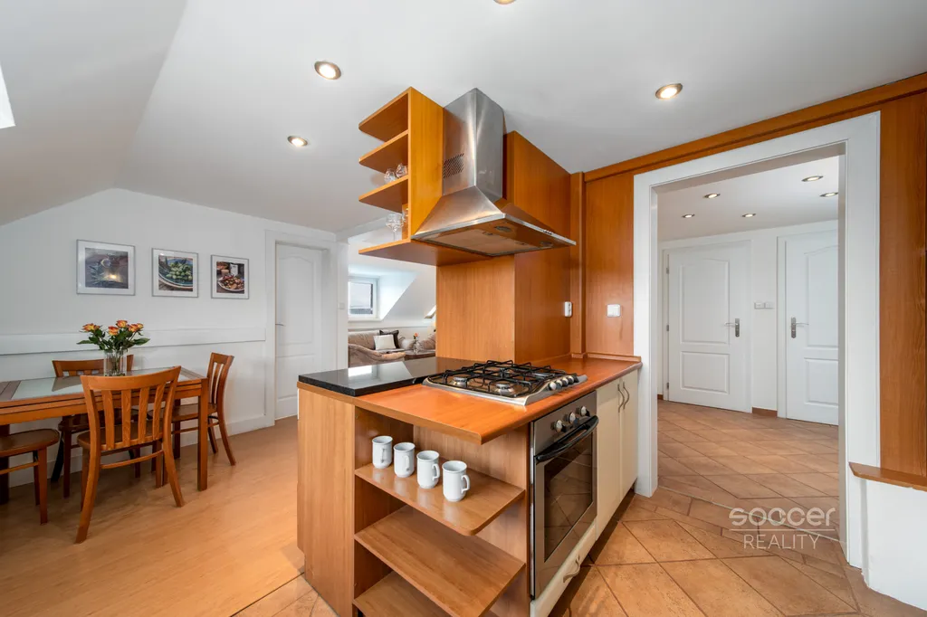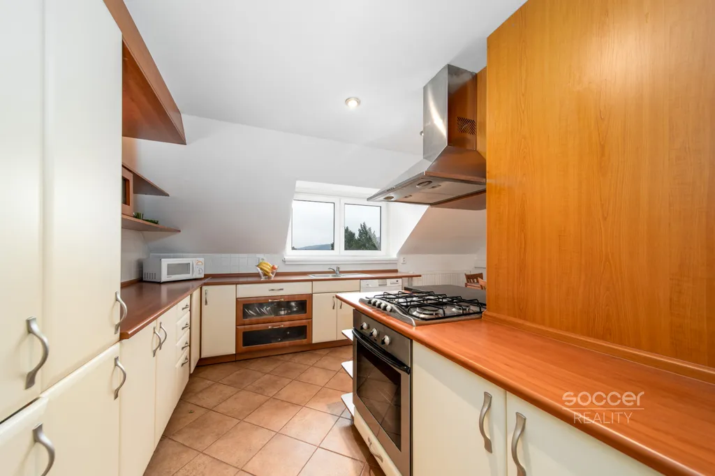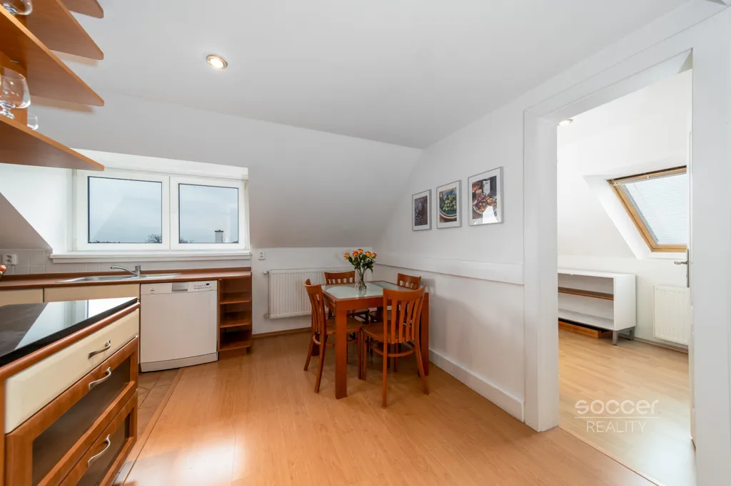 Vzdušný a velmi příjemný interiér je plně vybaven vkusným nábytkem i spotřebiči. K dispozici je velký obývací pokoj s pracovním koutem, kuchyňský kout s jídelnou, samostatná ložnice, obytná mistnost v podkroví, koupelna s vanou i sprchou, toaleta a vstupní chodba s vestavěnou skříní. Dřevěné prvky krásně podtrhují originalitu místa. Parkování je v ulici i okolí bezplatné.