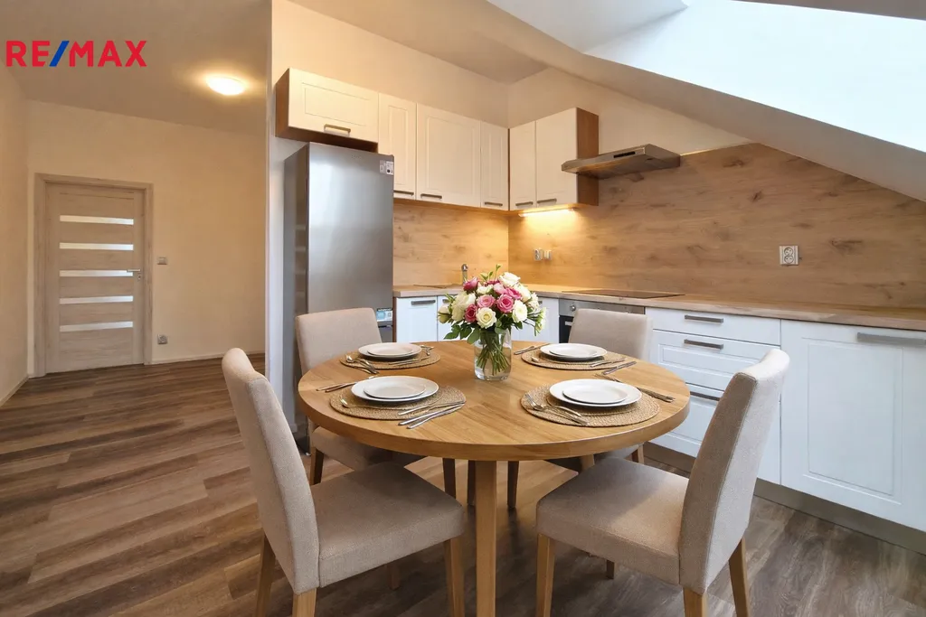 Byt tvoří vstupní předsíň (7,6 m2), ložnice (10,5 m2), obývací pokoj + kk (21,5 m2), pokoj (14,3 m2) a koupelna se sprchovým koutem, umyvadlem a wc (8,1 m2). Moderní komfortní kuchyňská linka je vybavená myčkou, ledničkou s mrazákem a digestoří. Dveře i obložkové zárubně jsou v dekoru dřeva, střešní okna jsou kombinace dřevo/plast. Byt je vytápěn tepelným čerpadlem (vzduch/vzduch) a podlahovým topením (podlaha vinyl a dlažba). Na předsíni je umístěný elektrický kotel, ohřev vody zajišťuje bojler umístěný v koupelně. Po půdních výsuvných schodech, umístěných v předsíni se dostáváme do půdního prostoru, který představuje další velkorysé možnosti využití. Při rekonstrukci byl kladen velký důraz na protihlukovou izolaci – protihlukový sádrokarton, PUR, kročejová podlahová izolace.