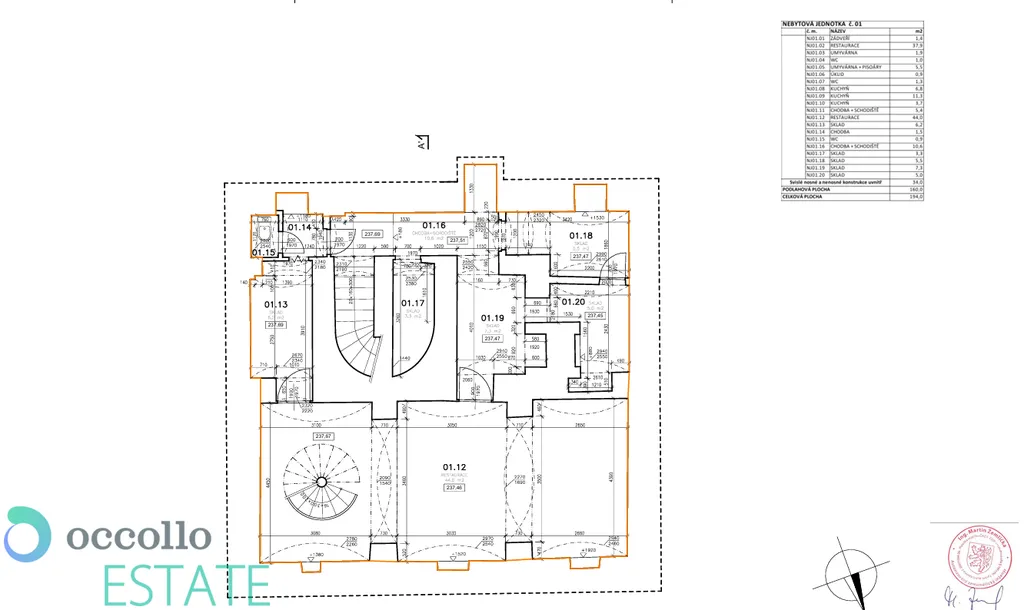 Celková plocha prostoru činí 193,3 m² a je rozdělena do 1. nadzemního podlaží a 1.