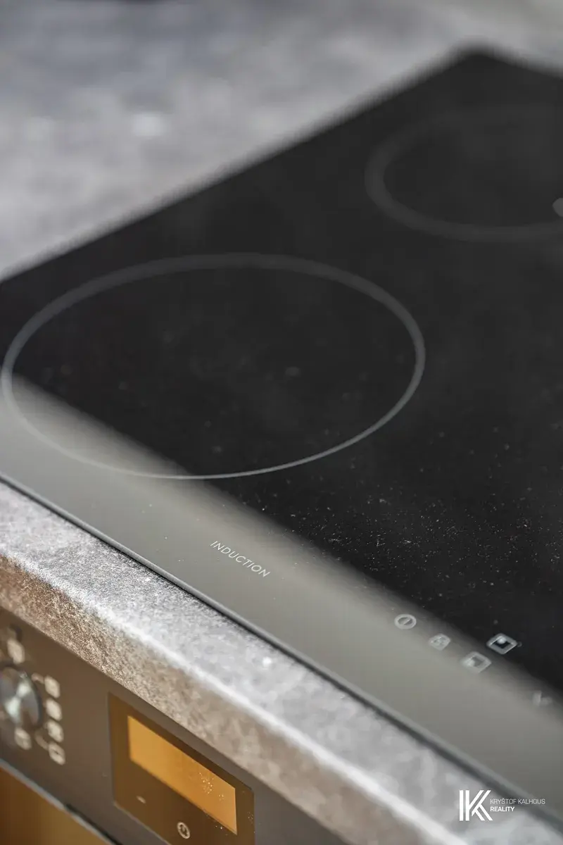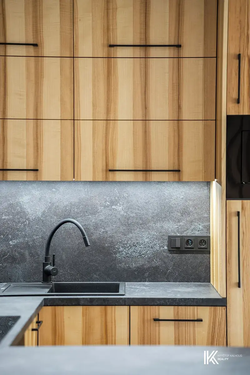 V prvním patře se nachází obývací části s moderní kuchyňskou linkou vybavenou vestavěnými spotřebiči – elektrickou troubou, varnou deskou, mikrovlnnou troubou, lednicí s mrazákem a myčkou. Kuchyňský prostor je doplněn o promyšlené úložné prostory po celém obvodu zdi.