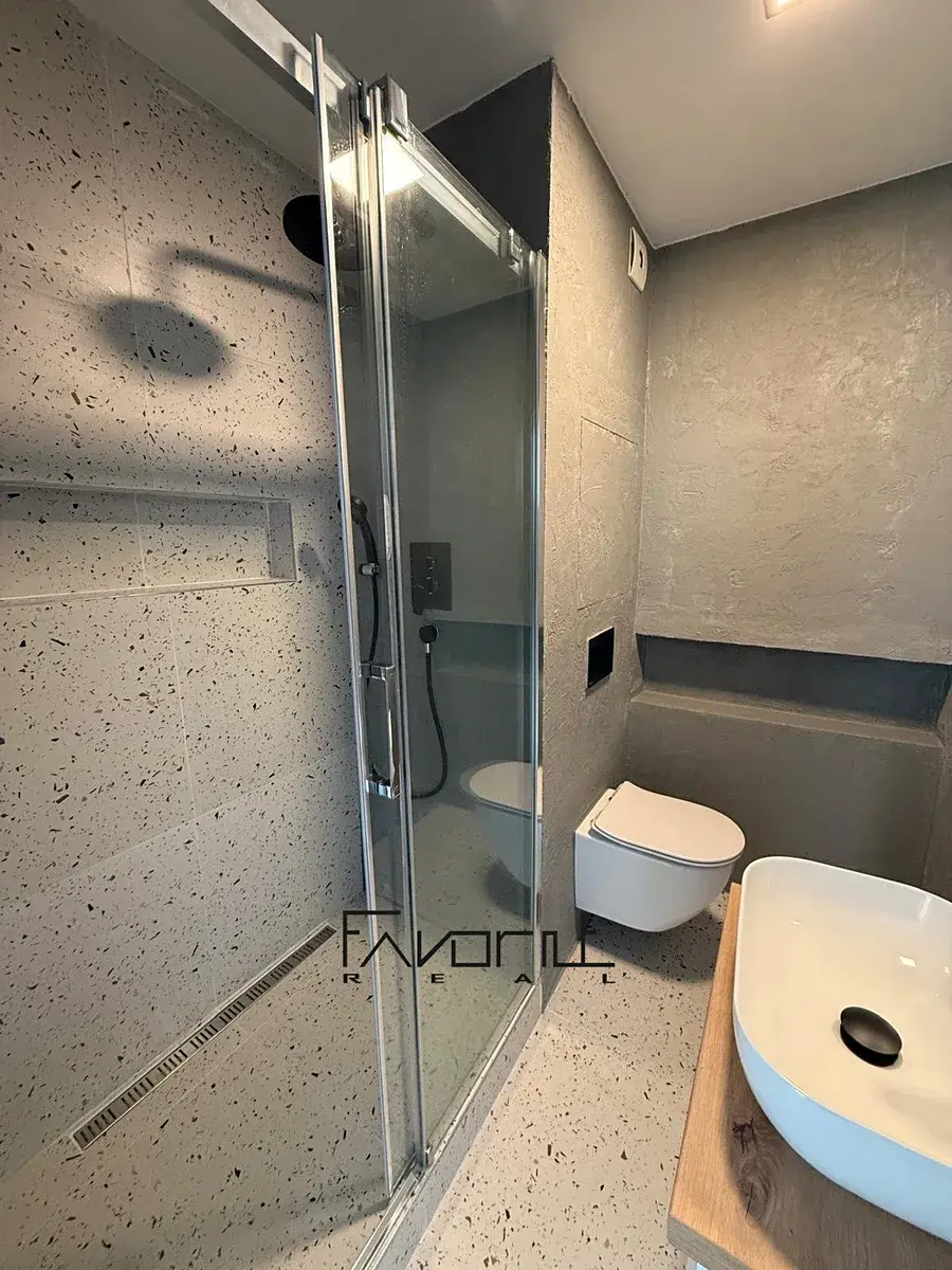 Nivelace podlah před položením plovoucí podlahy (srovnání). Barva podlahy v odstínu dřeva. Na podlahách jsou zátěžové plovoucí podlahy. Nové interiérové a vstupní dveře včetně obložek, vypínače a zásuvky. Nové kvalitní omítky.