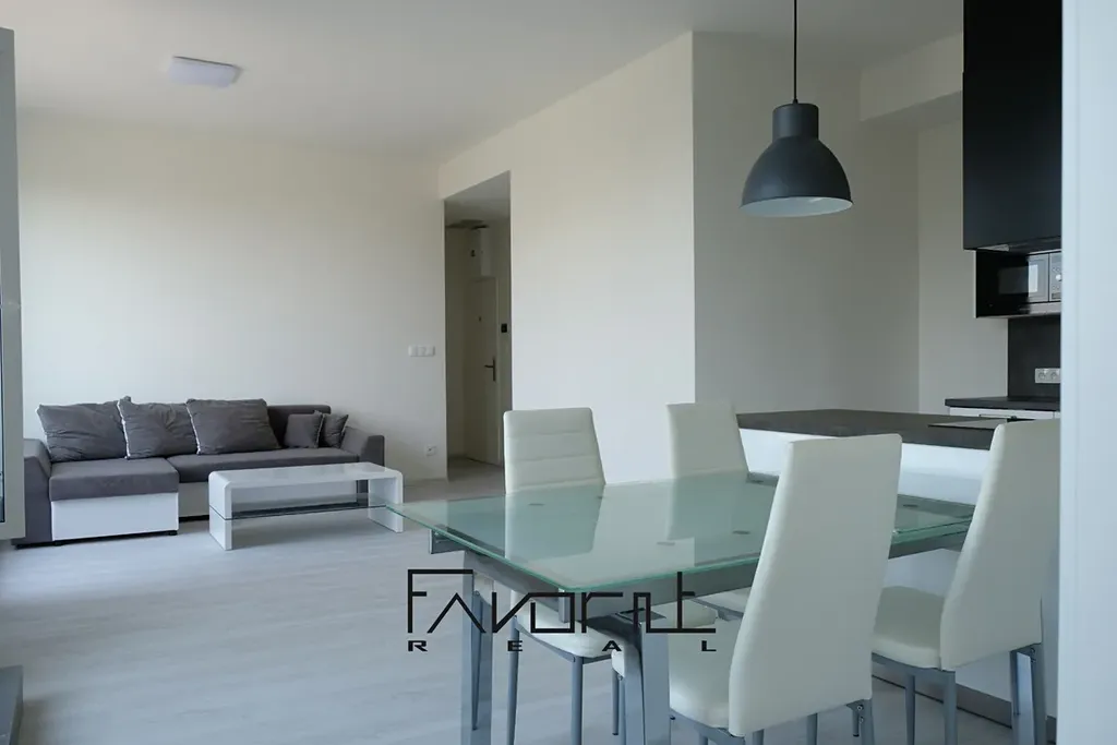 Dispozice bytu: obývací pokoj s kuchyňským koutem a vstupem na terasu, samostatný ložnicový pokoj, prostorná chodba, dvě koupelny, sprchový kout, vana. WC je zvlášť.