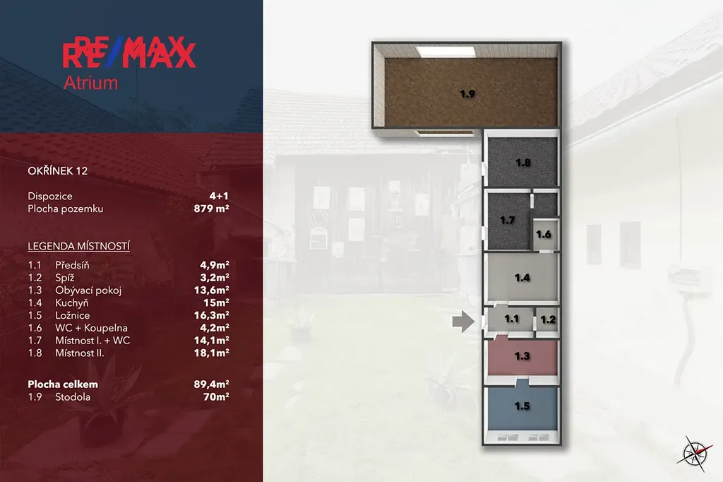 Pozemek, na kterém dům stojí, má celkovou rozlohu 879 m², a za domem se rozkládá velká louka a pole. Kapitolou samou pro sebe je stodola, která i po letech stále plní svou funkci – je ale pouze na vás, na co ji proměníte.