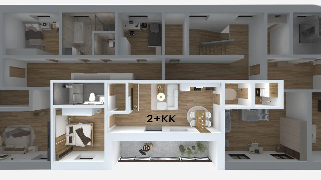 Projekt půjde do výstavby v roce 2026 a bude dokončen a zkolaudován na konci 1. pololetí 2027. V domě budou vybudovány ještě jednotky o dispozici 4+kk (117 m2) a 3+kk (90 m2) (rovněž naleznete v inzerci).