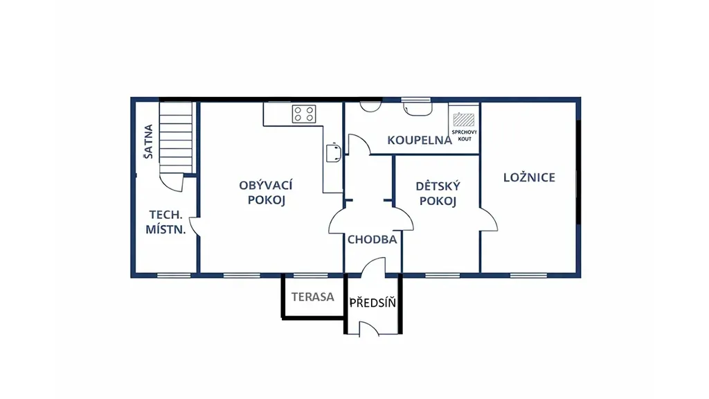V přízemí se nachází prostorný obývací pokoj s kuchyňským koutem, dále koupelna se sprchovým koutem, WC a vanou, 2 pokoje a technická místnost s WC a vstupem na rozlehlou půdu s úložným prostorem.