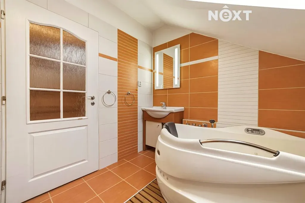Ložnice nabízí vestavěné skříně se zrcadly, které nenápadně zvětšují prostor i sebevědomí. Koupelna je prakticky řešená – vana, umyvadlo, toaleta a chytrý vestavěný nábytek včetně integrovaného koše na prádlo. Podlahy kombinují plovoucí podlahu a dlažbu.