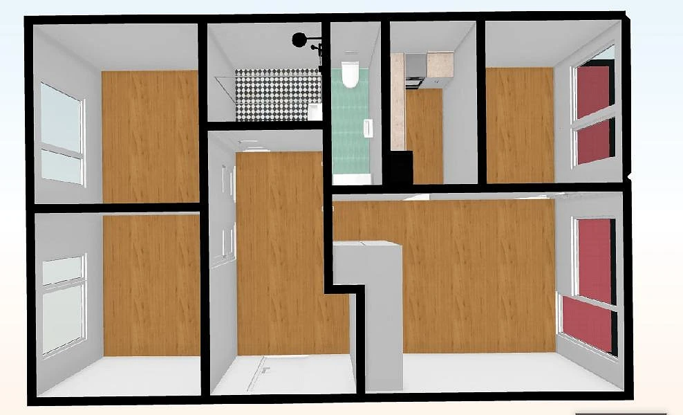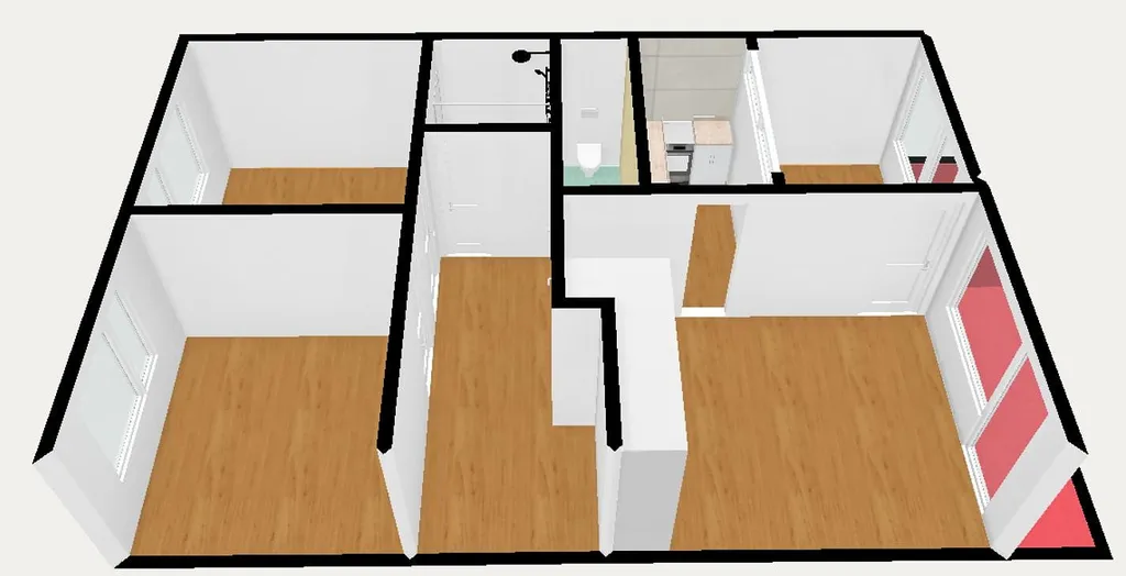 Byt je nově dispozičně upraven. Z původního 3+kk byly vytvořeny 4 samostatné pokoje a kuchyň. Ústřední část bytu tvoří obývací pokoj s přímým vstupem na prostorný balkon (orientace na jiho-východ) a dále se vstupem do dalšího pokoje a samostatné kuchyně. Další dva pokoje tvoří ložnice a dětský pokoj s orientací na západ. Dále je v bytě samostatné WC s pračkou a koupelna se sprchovým koutem.