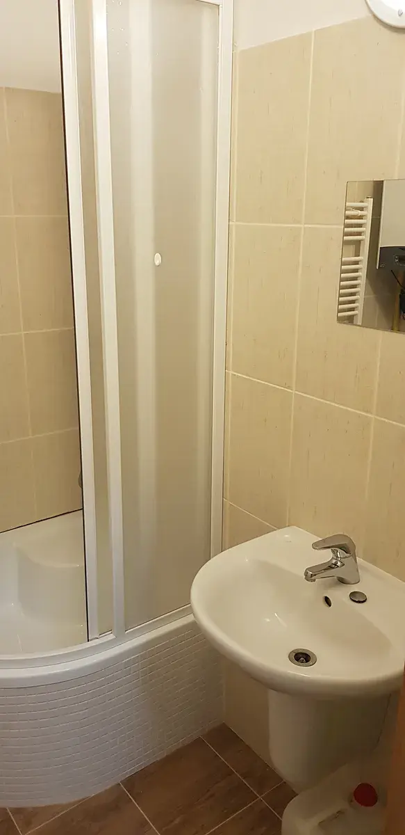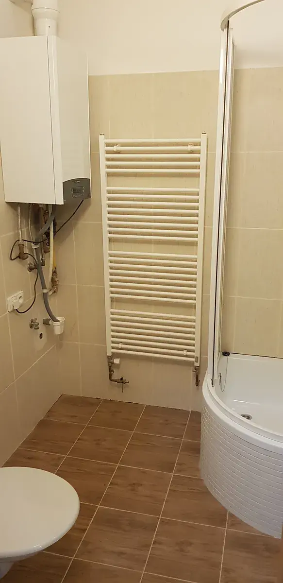 Vlastní kotel pro vytápění a ohřev vody, radiátory, sanitární keramika a vodovodní baterie.