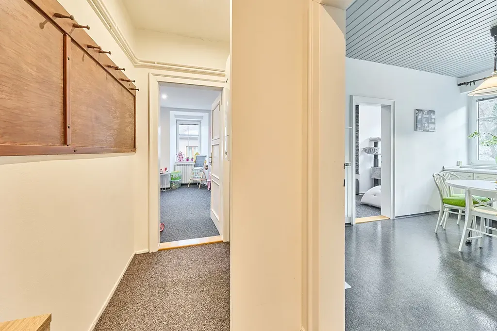 Dispozice bytu: předsíň, po pravé straně je vstup do prostorné kuchyně a následně do obývacího pokoje. V kuchyni je možnost umístěný krbových kamen (vyvložkovaný komín). Z obývacího pokoje je vstup do dětského pokojíčku. Do něhož je druhý vstup i z předsíně. Po levé straně je samostatné WC, koupelna a další dvě obytné místnosti (ložnice a další dětský pokoj).