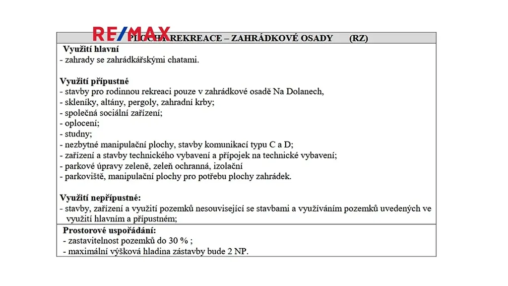 Pozemek je svažitý, s jiho-západní orientací, je na něm umístěna původní kopaná studna a plechová mobilní garáž, dříve započala výstavba plotu (vyzdění sloupků). Na pozemku je možnost umístění zahradní chatky či drobné rekreační stavby (dle platného územního plánu, pozemky kat. RZ - rekreace, zahradní osady).