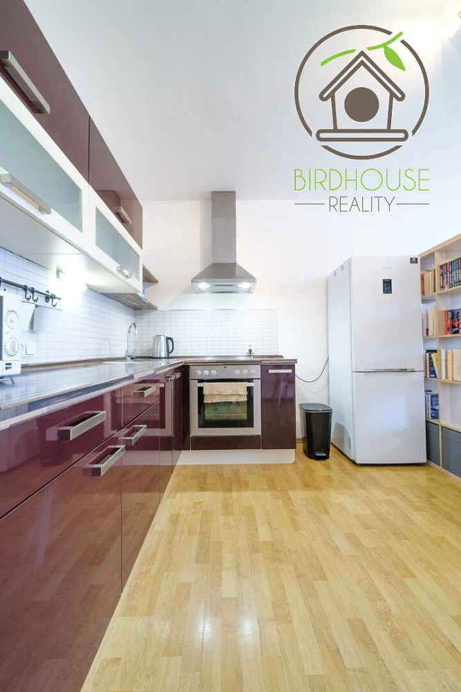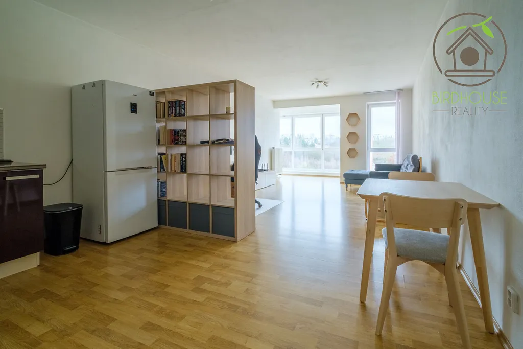 Srdcem bytu je prostorný a světlý obývací pokoj (35,81 m²) s moderním kuchyňským koutem a zákoutím. Kuchyňská linka nabízí dostatek úložného prostoru a je osazena kvalitními spotřebiči jako je například sklokeramická varná deska, nebo elektrická horkovzdušná trouba.