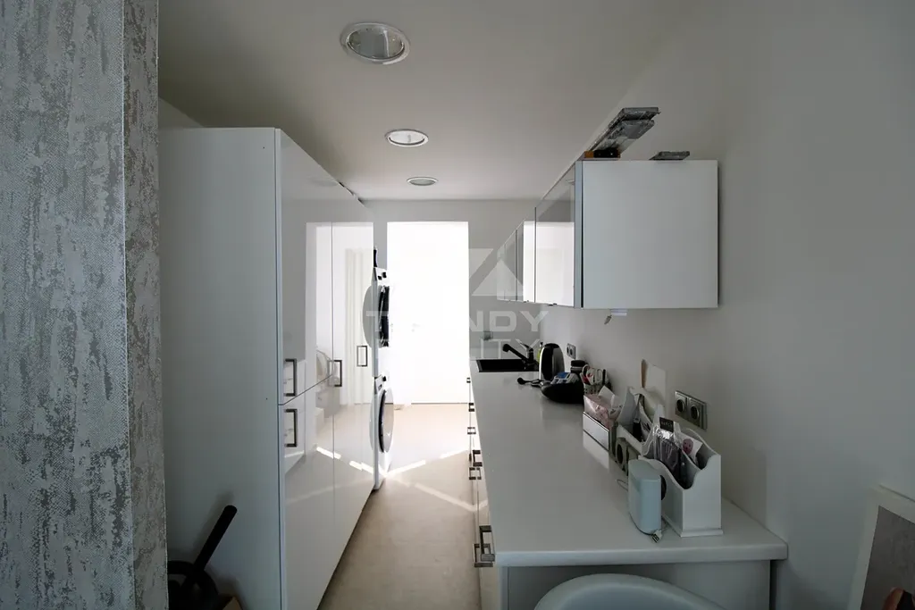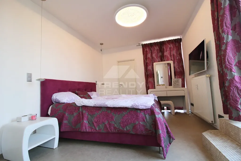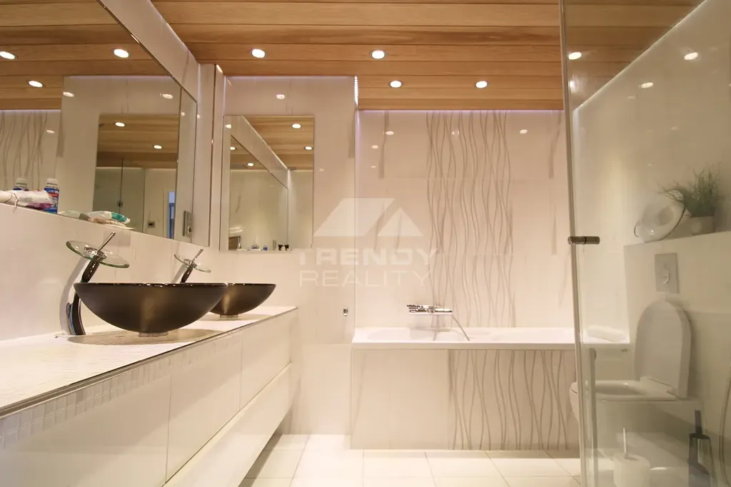 Vybavení: Nejvyšší standard materiálů, klimatizační jednotky v každé místnosti, centrální dálkové podlahové vytápění v kuchyni a koupelně, značková kožená sedací souprava značky Natuzzi.
