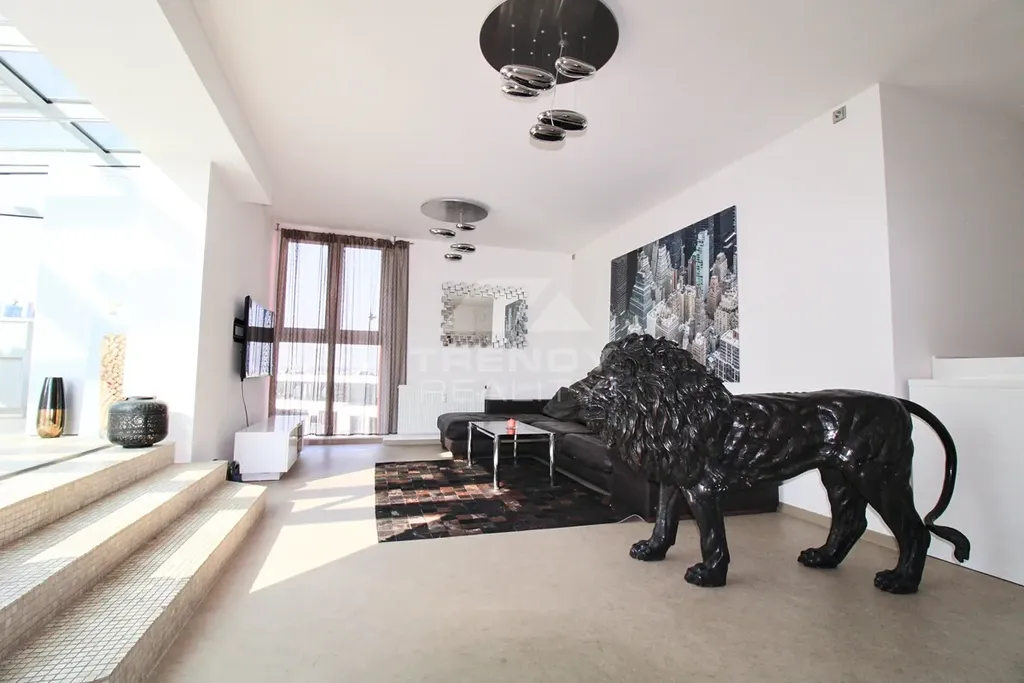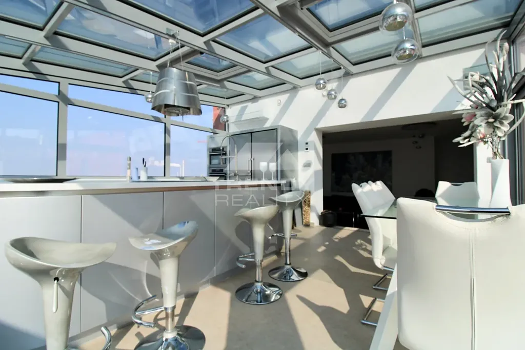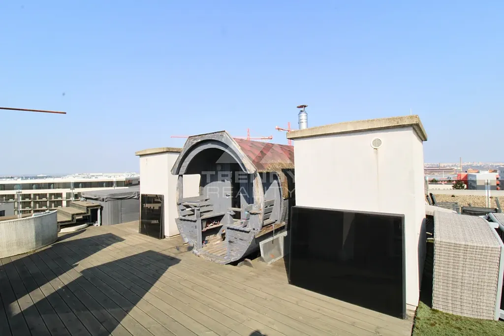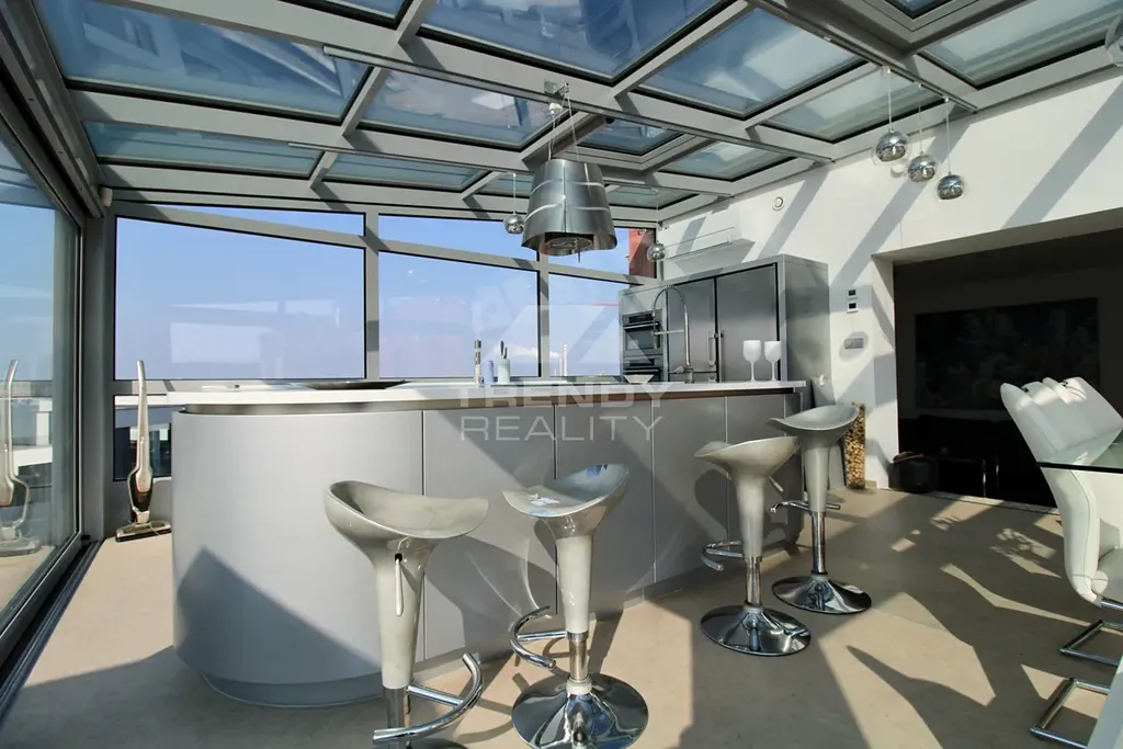 Terasy: Dvě velkorysé terasy (celkem 150 m²) s vířivkou a finskou saunou – perfektní pro relaxaci s výhledem do města.