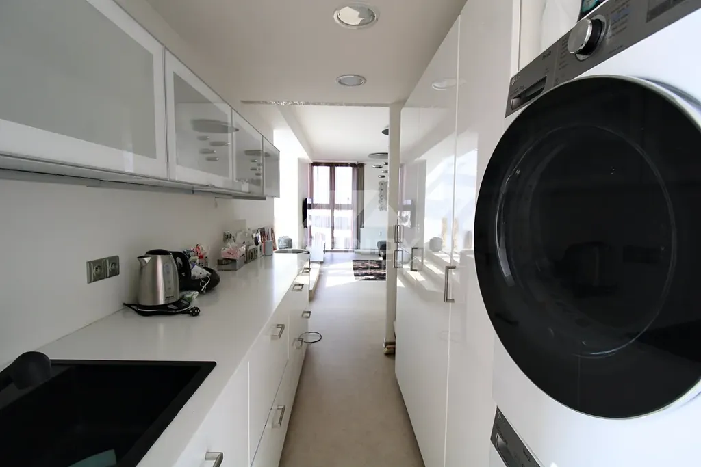 Obývací část s kuchyní: Propojený prostor s kuchyňskou linkou z ušlechtilých materiálů (nadstandardní vestavěné spotřebiče – top značky), podlahovým vytápěním a klimatizací.