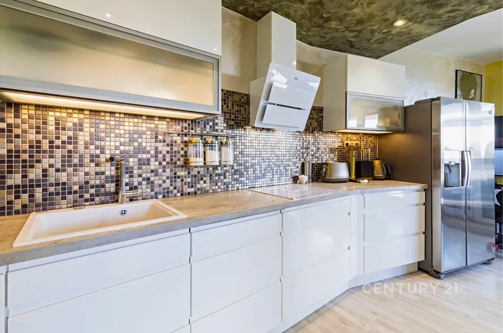 Interiér bytu byl navržen architektem tak, aby byl sladěn každý detail. Největší místnost je chytře rozdělena do čtyř zón – prostorné kuchyně ve vysokém lesku s nejmodernějšími spotřebiči, jídelním koutem, pracovním prostorem a obývací částí, ze které je přístup na hlavní terasu s výhledem do zeleně.
