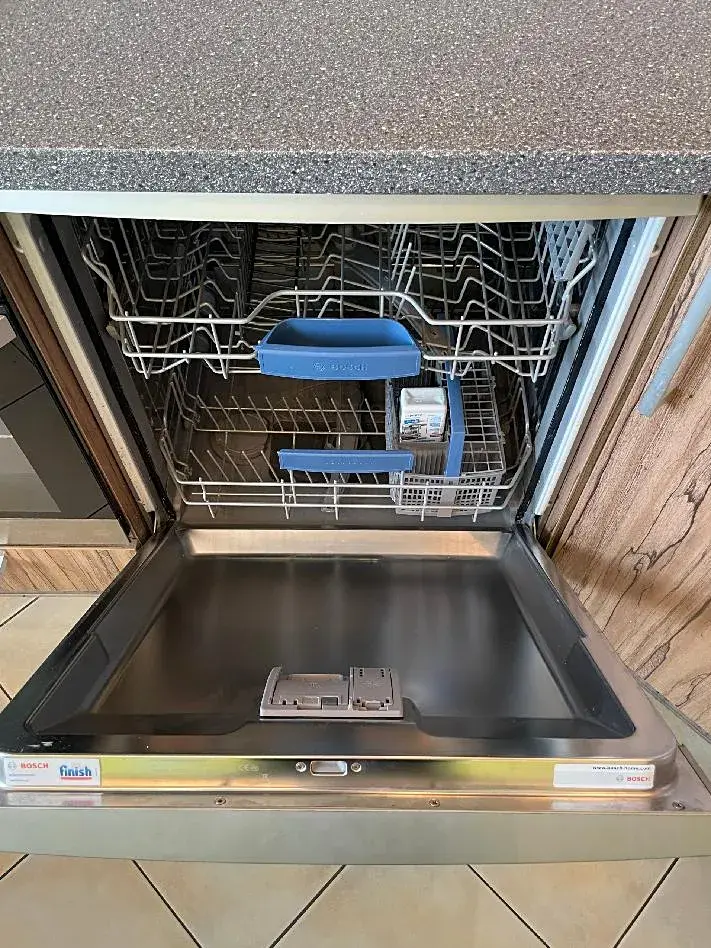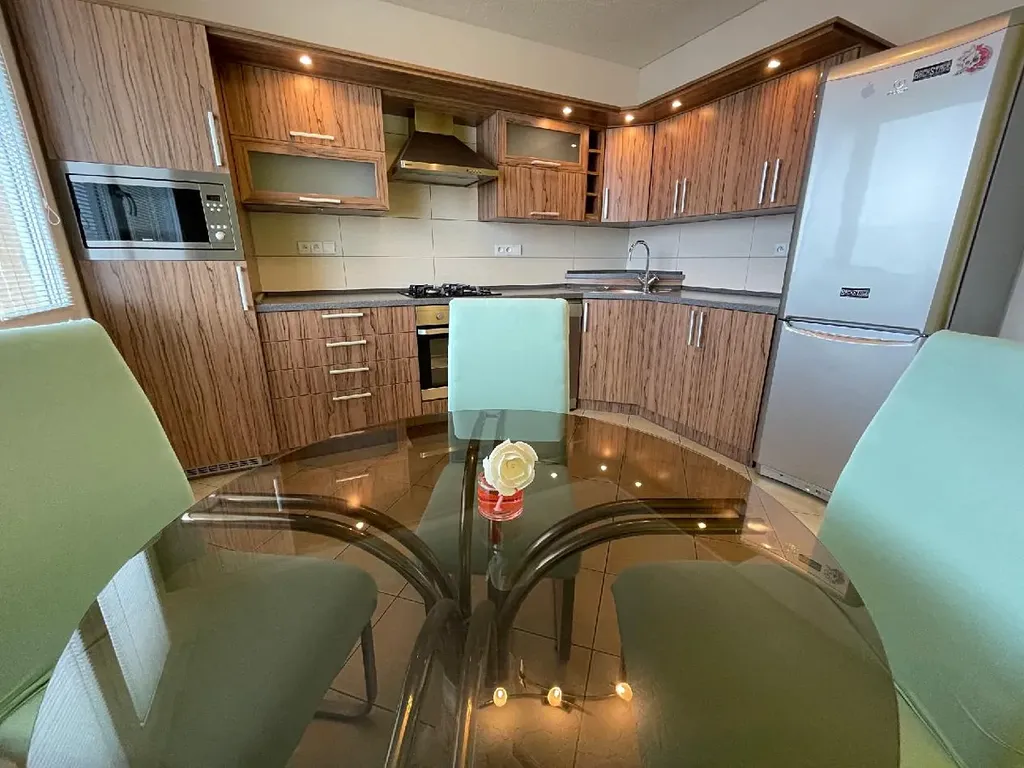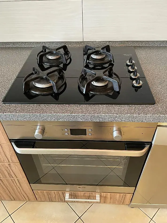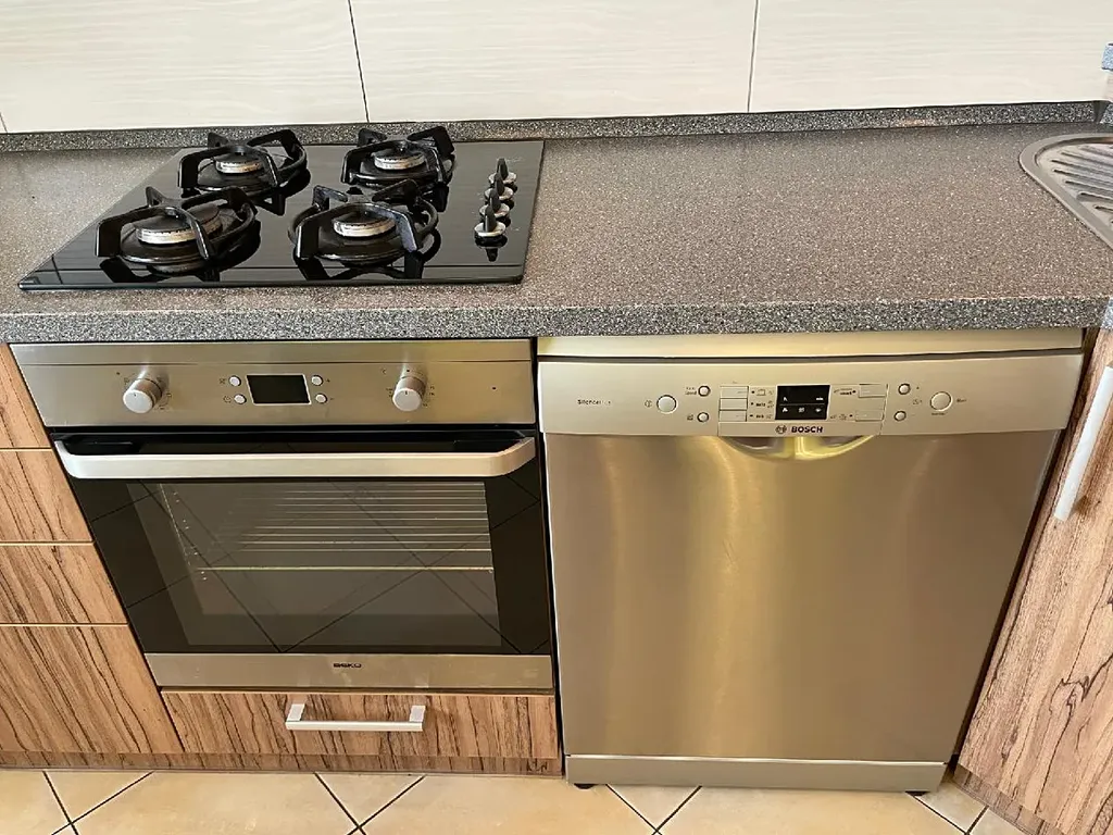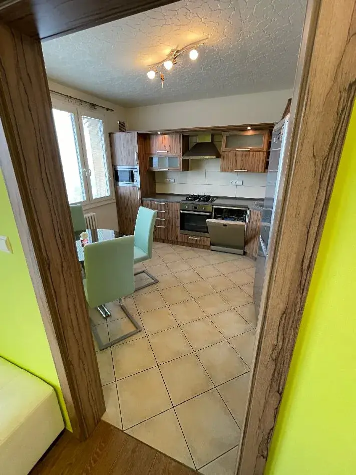 Kuchyně je vybavena nadčasovou kuchyňskou linkou ve tvaru "L", je zde vestavěná elektrická trouba BEKO, plynová varná deska BOSCH, volně stojící lednice s mrazákem INDESIT, vestavěná mikrovlnná trouba BEKO a digestoř BEKO. Vše je bez poškození ve výborném stavu, plně funkční. Součástí vybavení je i skleněný jídelní stůl a 4 židle.