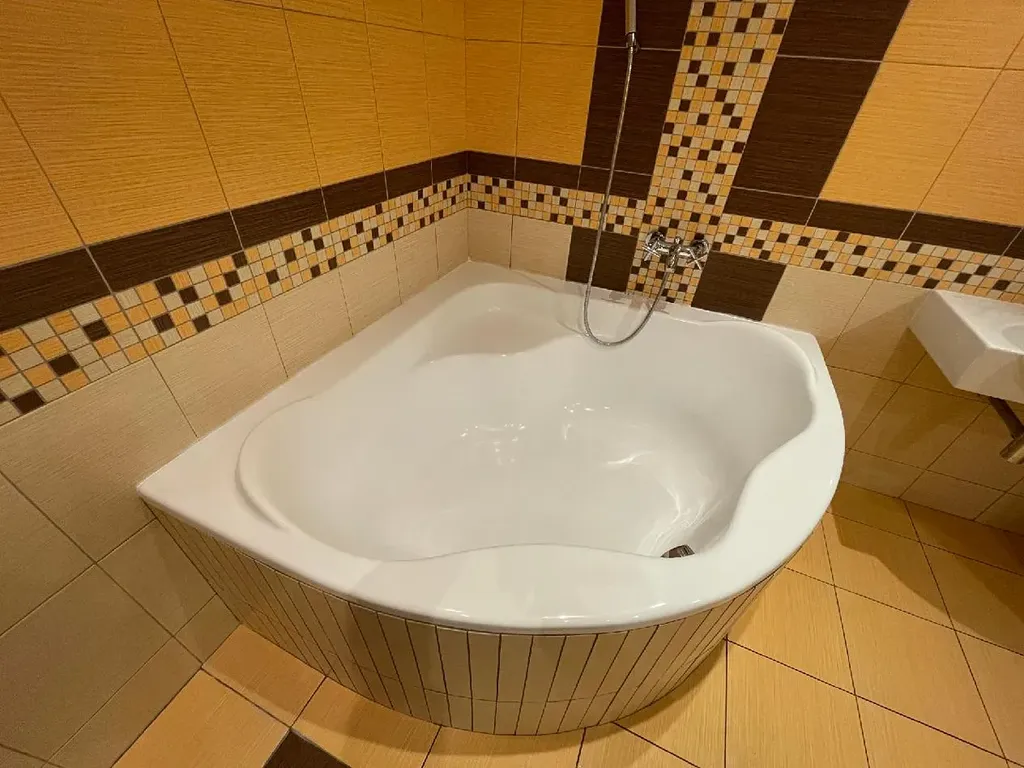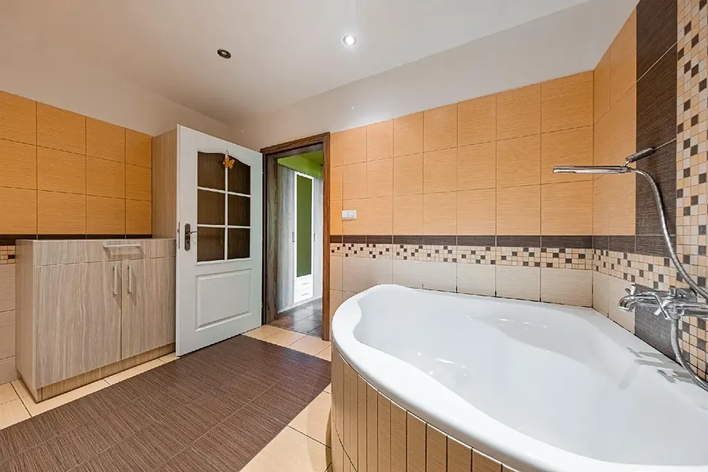 Velikostně opravdu nadstandartní koupelna disponuje rohovou vanou, umyvadlem se zrcadlem, WC, topným žebříkem, komodou, prostorem a připojením pro pračku a sušičku.
